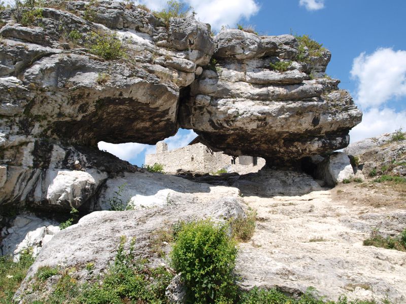 Skały łączące obydwa zamki to wapienie skaliste, będące pozostałością kolonijnych budowli gąbkowo-sinicowo-bakteryjnych, powstałych na dnie jurajskiego morza około 160-150 mln lat temu (więcej na ten temat znajdziesz w wycieczce pt.: Jak powstały ostańce skalne Jury Krakowsko-Częstochowskiej). Skały te, jako znacznie odporniejsze na czynniki atmosferyczne od skał je otaczających, oparły się wietrzeniu i stanowią obecnie charakterystyczny element krajobrazu jurajskiego (fot. 2). Z właściwości fizycznych tych skał korzystali średniowieczni budowniczowie, opierając o nie mury wznoszonych warowni.