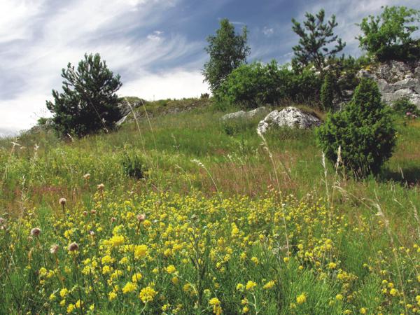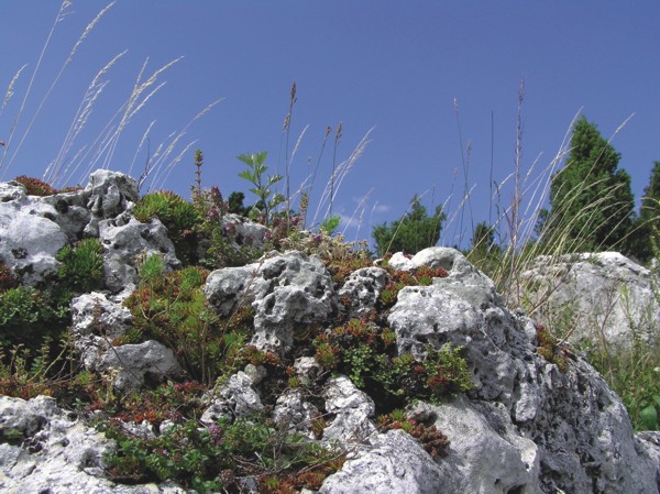 Grzęda Mirowsko-Bobolicka, podobnie jak wiele innych wzniesień jurajskich, ma asymetryczną budowę. Południowe zbocza grzędy są bardzo łagodne, a na nasłonecznionych stokach, wśród wapiennych skałek, dominują murawy kserotermiczne. Liczne zagłębienia i półki skalne, w których gromadzi się cienka warstwa próchnicy, są siedliskiem roślin naskalnych (fot. 4-5). W większych szczelinach skalnych osiedlają się niektóre krzewy, między innymi irgi i jałowce.