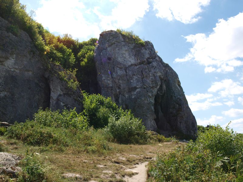 Po północnej stronie wzniesienia okazale prezentują się pionowe ściany skalne, dochodzące nieraz do 20 m wysokości, a ich fantazyjne kształty są wynikiem zachodzenia procesów tektonicznych i krasowych. Z uwagi na niemal stałe zacienienie, po tej stronie grzędy rozwijają się rośliny unikające słońca, takie jak mchy i paprocie. Poprowadzona u podnóża skał ścieżka doprowadza do Jaskini Stajnia (fot. 6).