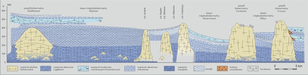 Budowle biohermalne często tworzyły zespoły zbudowane z wielu bioherm (tzw. zespoły biohermalne) o znacznej rozciągłości (do kilkunastu kilometrów), pomiędzy którymi znajdowały się rozległe obniżenia – baseny międzybiohermalne (rys. 2). Na obszarach pomiędzy biohermami, m.in. w basenach międzybiohermalnych, osadzały się różnorodne osady wapienne i margliste, z których powstały skały uławicone, często bogate w muszle swobodnie pływającej fauny morskiej lub w konkrecje krzemienne.